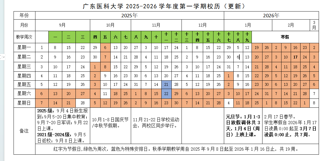广东医科大学2025-2026学年度第一学期校历(更新)